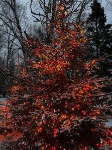There’s just something about trees when they have a light dusting of snow on them, with Christmas lights glowing in early morning that makes a person smile.